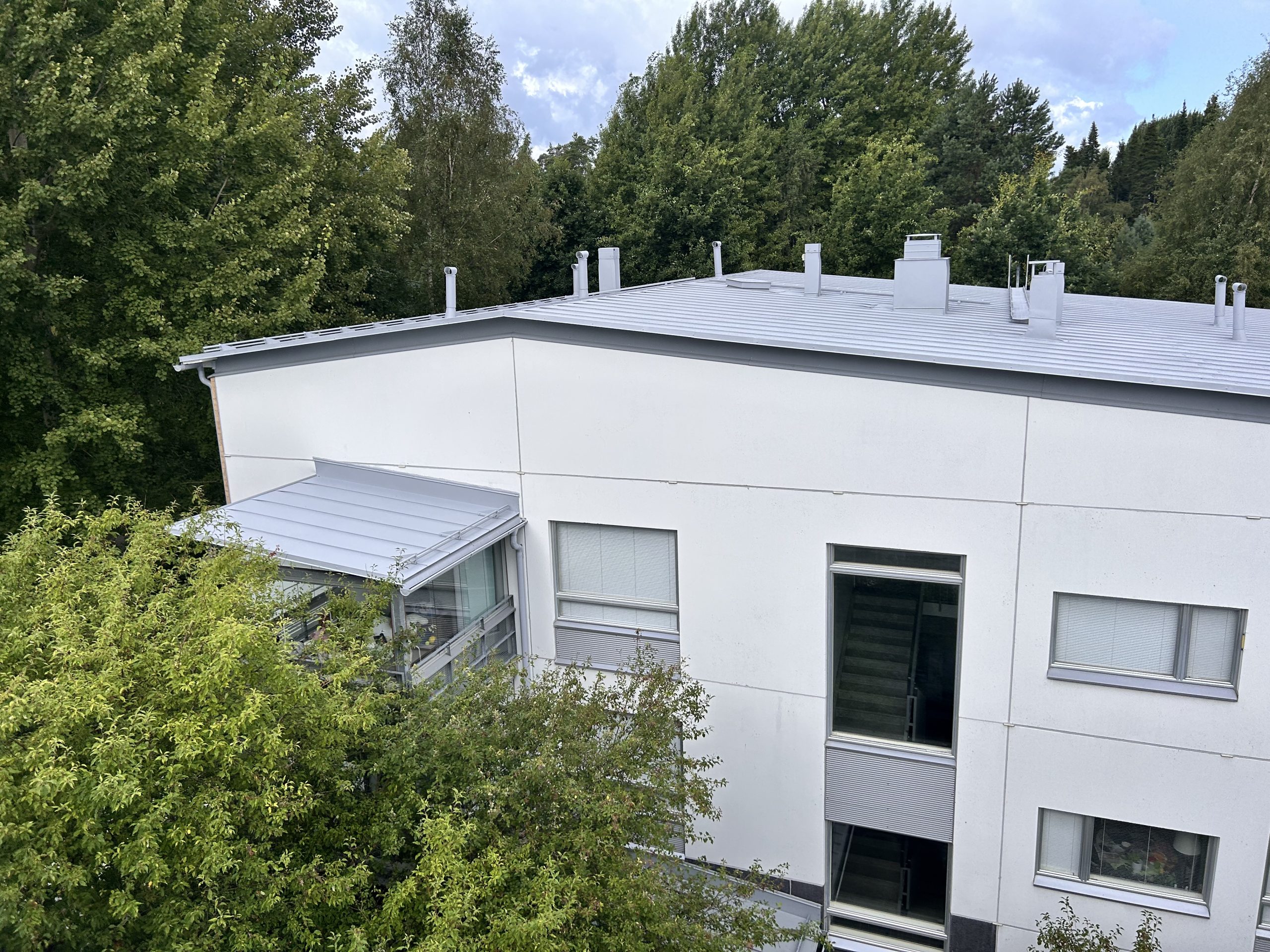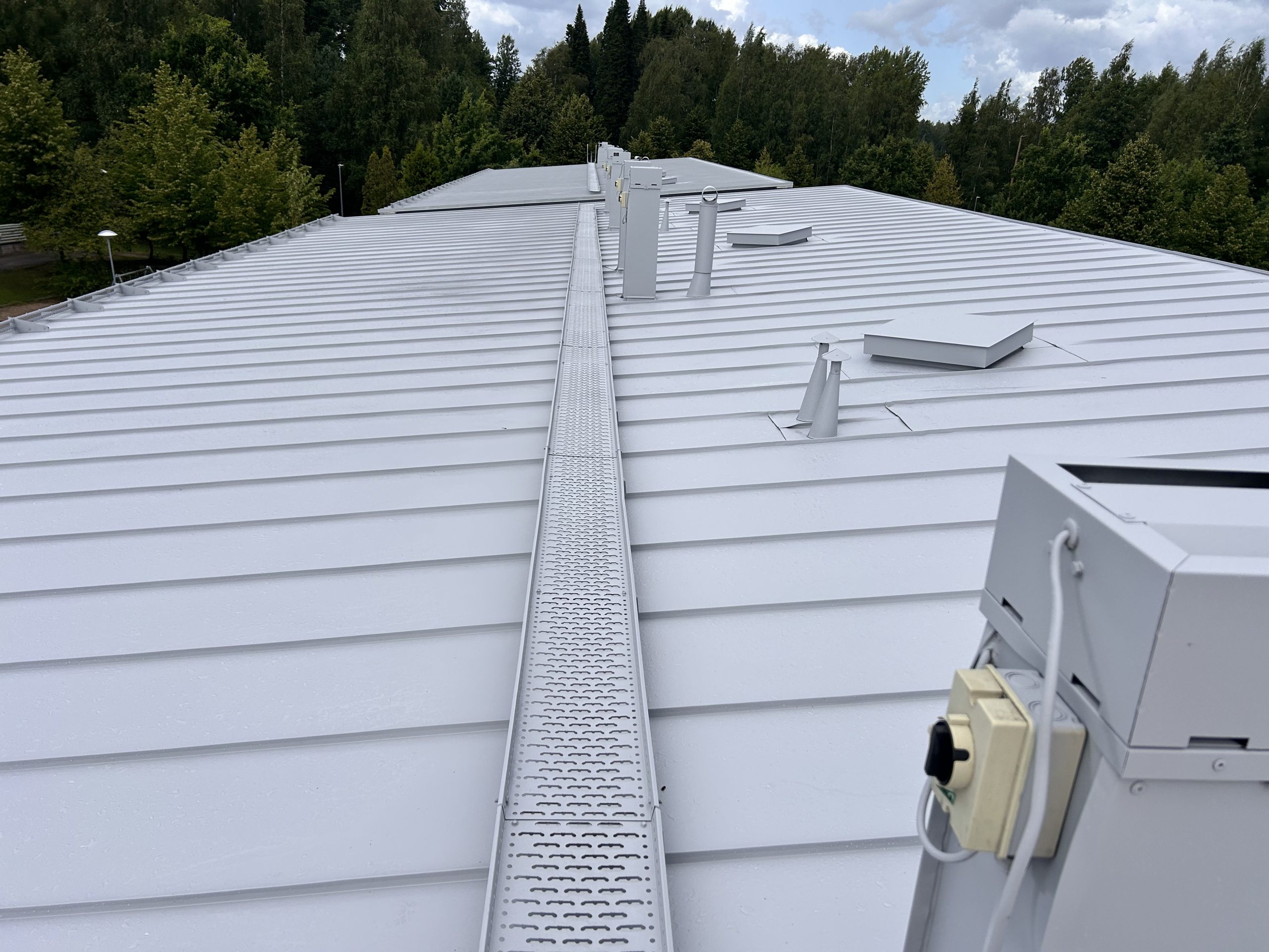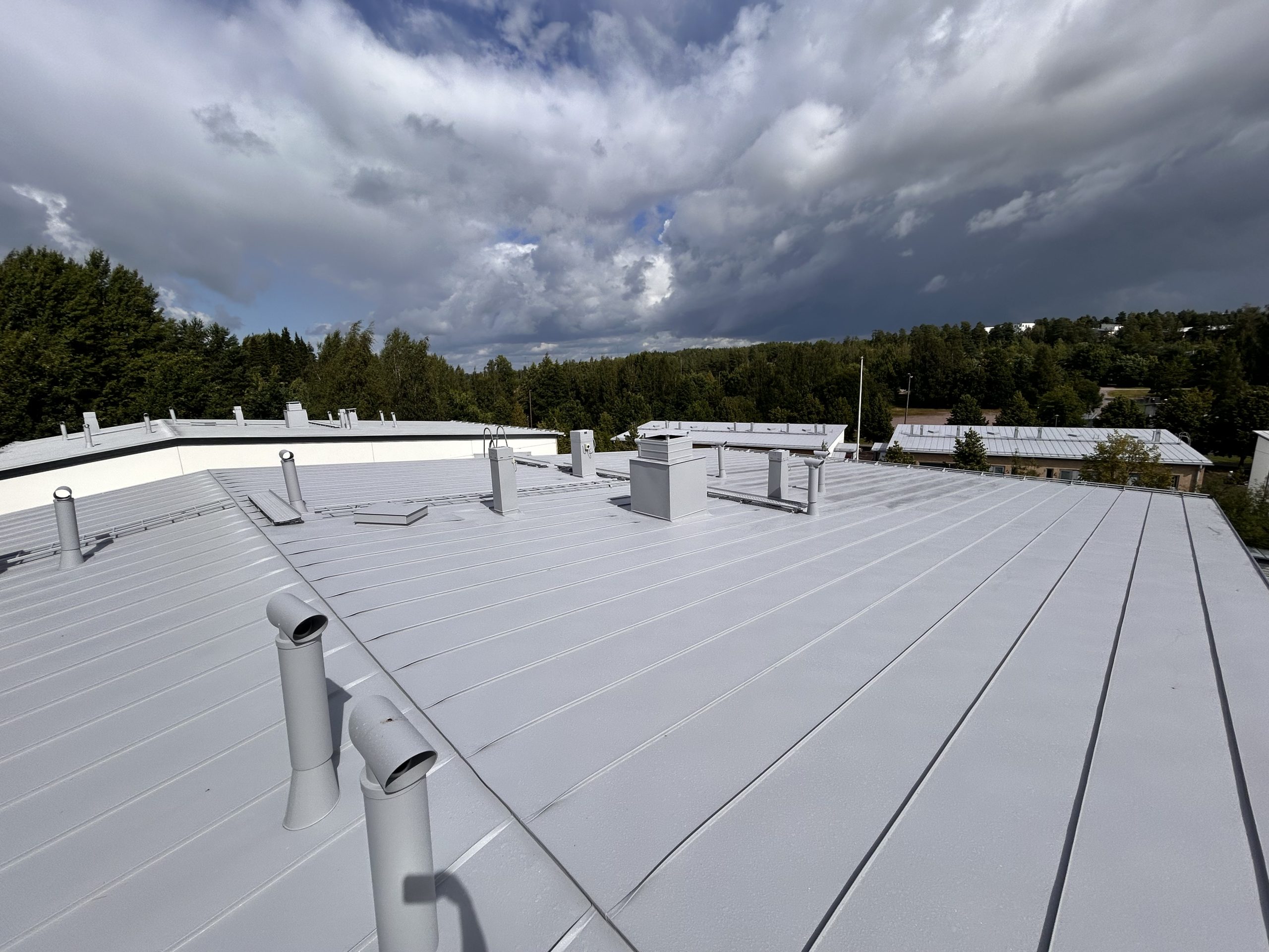Helsingin Kivikossa, osoitteessa Nallitie 8, suoritettiin vesikatteelle normaali osakorjaus- ja huoltomaalaus ja samalla tehtiin paikallisia osakorjauksia. Corro Oy toimi hankkeessa avaimet käteen rakennuttajakonsulttina, tarjoten hankkeen projektinjohtorakennuttamisen, suunnittelun ja valvonnan. Lue lisää vesikattohankkeiden projektinjohdosta ja valvonnasta! Kuumasinkitty ja maalattu rivipeltikate, eli niin sanottu konesaumakatto tulee keskimäärin huoltomaalausikään 10…15 vuoden välein, RT-103765 Kiinteistön keskimääräiset tekniset käyttöiät ja kunnossapitojaksot Rakennustekniikka -julkaisun mukaan. Julkaisu perustuu vuosikymmenten aikana kerättyyn tilastolliseen dataan. Huoltomaalauksen yhteydessä löytyy usein enemmän tai vähemmän pientä korjattavaa, joko katon huoltotöiden laiminnlyönnistä johtuen, vääristä huolto- ja lumenpudotustavoista tai muista syistä johtuen. Siksi hanketta nimitetäänkin Corro maailmassa nimellä vesikaton osakorjaus ja huoltomaalaushankkeeksi. Mikäli vesikatolla ylläpidetään toimivaa vuosiahuoltoa ja osakorjaus ja huoltomaalaushankkeet tehdään ajallaan, on todennäköisestä konesaumatun vesikatteen tekninen käyttöikä kevyimmässäkin rasitusluokassa (80 vuotta) saavutetaan ja jopa ylitetään.