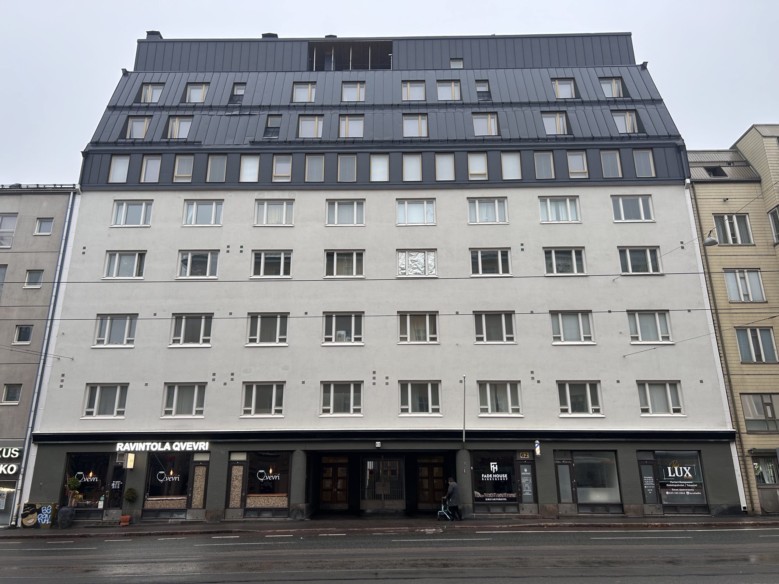 Julkisivujen rappaustöiden valvoja – Hämeentie 62, Helsinki. Valvoimimme tämän osoitteessa Hämeentie 62, Helsinki sijaitsevan laajan julkisivukorjaushankkeen julkisivujen rappaustöiden valvojana sekä taloyhtiön rakennuttajakonsulttina koko hankkeen ajan. Kyseessä oli 1940-luvulla valmistunut kerrostalo, jonka katu- ja sisäpihan rapatut julkisivupinnat olivat tulleet teknisen käyttöikänsä päähän ja edellyttivät kokonaisvaltaista peruskorjausta. Kiinteistö sijaitsee näkyvällä paikalla Hämeentiellä, joten sekä tekninen laatu että julkisivun arkkitehtoninen ilme olivat hankkeessa keskeisiä tavoitteita. Toimimme ns. projektinjohtovalvojana tarjoten lisäksi rappaus- ja korjaustöiden suunnittelutehtävät. Katso lisää julkisivukorjausten palveluista.
